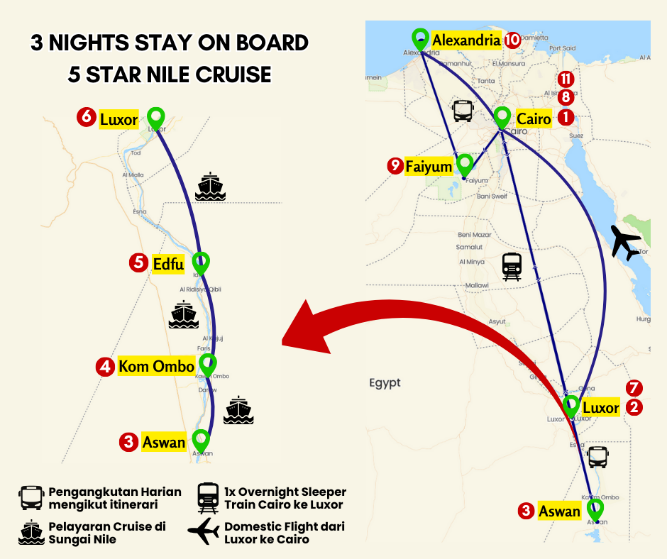 TERMASUK: 1x PENERBANGAN DOMESTIK, 1x KERETAPI MALAM, BERMALAM DALAM PELAYARAN 5 BINTANG NILE CRUISE